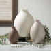 This trio of teardrop-shaped vases, each with a slender opening, offers a stylish way to showcase your favorite seasonal greenery all year long. Ideal for adding charm to any living room, bedroom, or guest bathroom, these gray and brown vases can be elegantly displayed as a group or scattered individually. Enhance your space with this beautiful set from the Cali Collection.